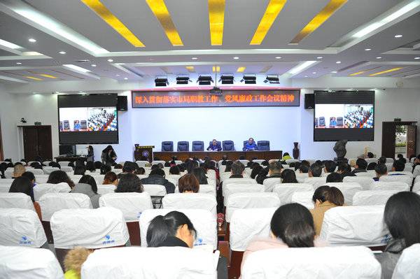 3月14日,在我校报告厅召开以“深入贯彻落实党风廉政工作、市局职教工作会议精神”为主题的教职工大会,全体教职工参加,校长陈全宝主持。
