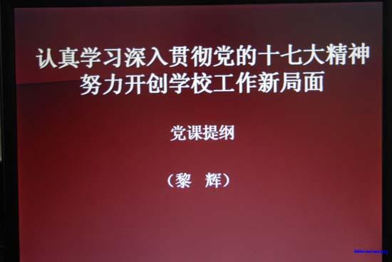 2007年11月19日,长沙市财经职业中专学校全体党员聚集会议室,认真听取了黎辉书记题为“认真学习深入贯彻党的十七大精神,努力开创学校工作新局面”的学习十七的辅导报告。