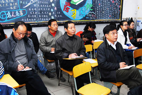 党委书记李志彬、副校长彭建成和老师们正在听课