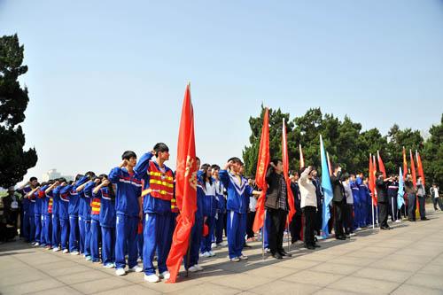 早上8:30,志愿者们从6163银河国际(荷花池校区)出发,经过近一个小时的徒步,顺利到达烈士公园烈士塔前坪;然后进行了敬献花圈、默哀一分钟、奏唱国歌,领导献辞,青年教师代表演讲、集体宣誓,祭扫烈士塔等7个环节的活动。