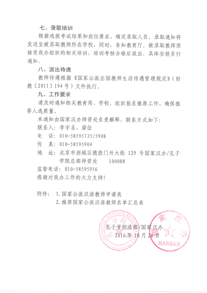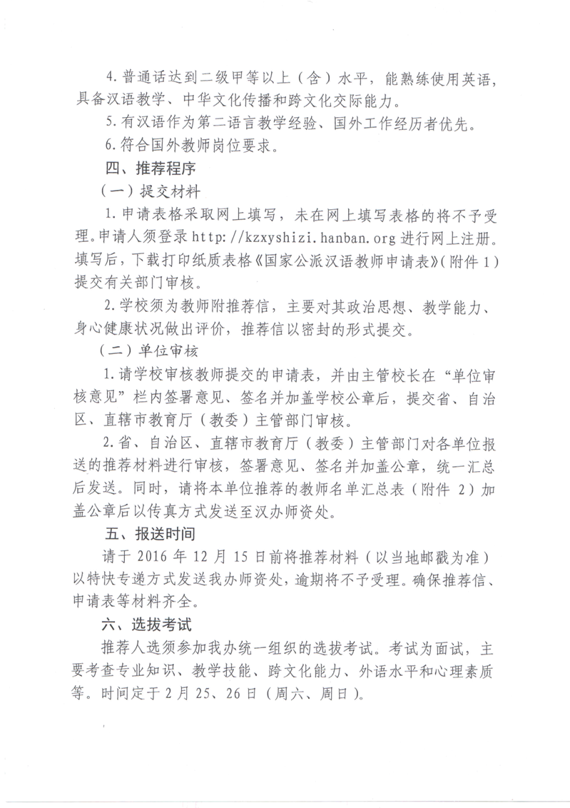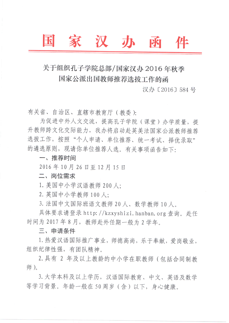 关于组织孔子学院总部/国家汉办2016年秋季国家公派出国教师推荐选拔工作通知
