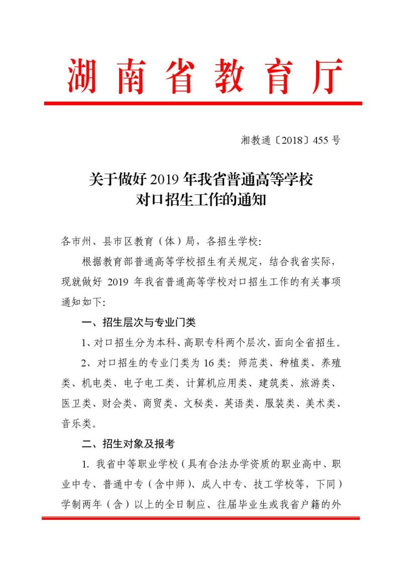关于做好2019年我省普通高等学校对口招生工作的通知