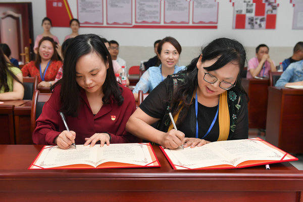 活动最后,共建单位党组织书记一同签订共建协议书,并进行了“结对共建支部”挂牌仪式。在主持人带领下,全体人员再一次郑重宣誓,重温入党誓词。活动结束后,周书记一行了参观校园,进一步了解了我校情况。