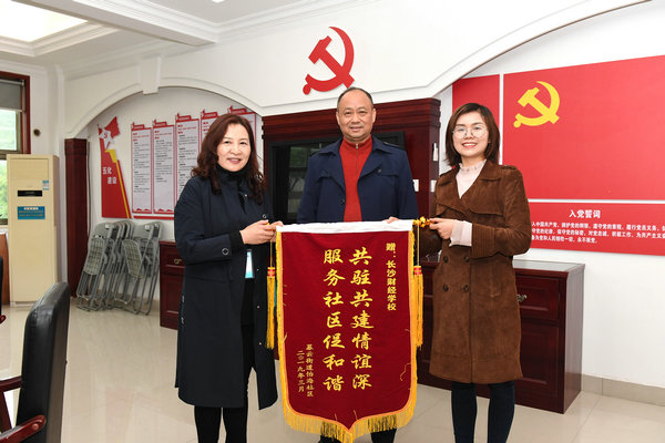 4月29日上午,天心区暮云街道怡海社区党支部书记向洪兵一行来到我校赠送锦旗,感谢我校在职党员积极参与怡海社区建设,为社区发展贡献力量。在我校党委书记彭建成、党务专干许红萍的陪同下,一行参观了党建活动室,对双方进一步共建共享进行了深入交流。