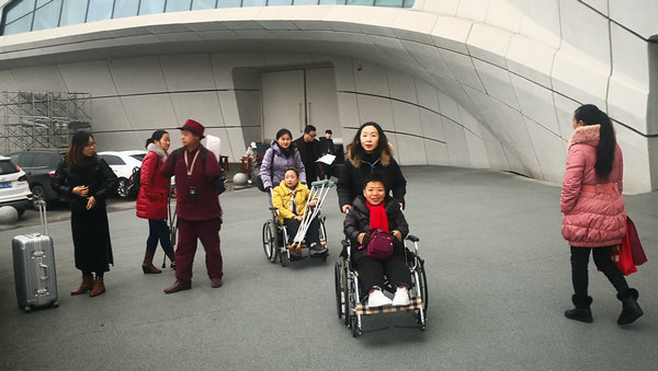 一到场地,党员同志就立马进入角色。领工作牌,与各自的组长衔接工作安排,提前熟悉工作场地,和不同小组人员的对接。杨迪书记和郭慧聪老师负责协助残障人士上下舞台,张子如、许国帅两位教师分别负责两个残障人士节目的化妆及相关工作。上午九点半,接到志愿者群内“浏阳残疾人艺术团”已经抵达门口的消息,同志们主动地投入到新的工作中,帮着卸运演职人员的行李、表演道具,协助残障人士下车、坐上轮椅,并负责推送至相应的化妆间。