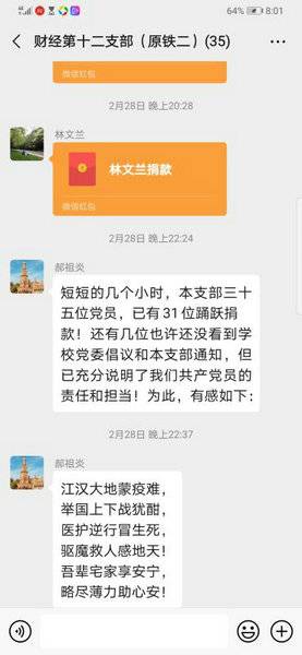 一声响应就是一份忠诚,一笔捐款就是一片爱心。倡议发出后,学校9个在职党支部和4个离退休党支部通过网络视频会议、党支部工作群等积极做好动员发动。短短2天时间,全校314名党员积极响应,纷纷通过微信、支付宝等方式贡献爱心,捐款率达百分之百。有的党员重病在身,有的并不宽裕,有的还在住院,他们依然慷慨解囊,充分彰显了党员干部对新型冠状病毒感染的肺炎疫情防控工作的支持与理解,体现了财经人齐心协力共抗疫情的决心。