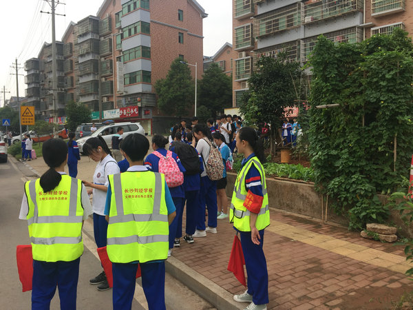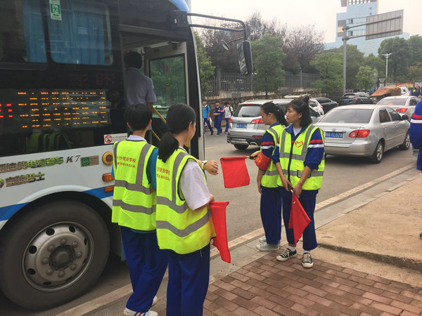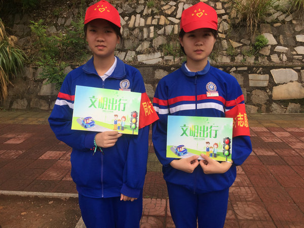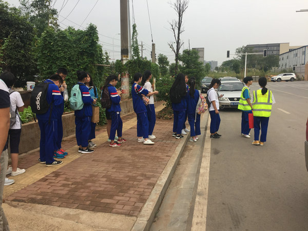 为确保学生出行的安全与有序,在学校领导的指导下,在学生处与团委的安排下,每周星期五放学后,由学生组成的文明劝导员被分成三个小组,分别在校门口、马路边和公交站旁通过宣传、劝导等方式,持续引导学生在公共场合有序出行、排队上车。