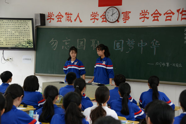 为纪念抗战胜利70周年,在“勿忘国耻,圆梦中华”主题团会上,老师们以甲午中日战争引出中国的屈辱近代史,还穿插了许多爱国英雄事迹,同学们热情高涨,朗读爱国诗歌,讲自己知道的爱国故事,畅谈自己对爱国精神的认识,同学们激情澎湃并励志成为爱国志士,发奋学习,报效祖国。