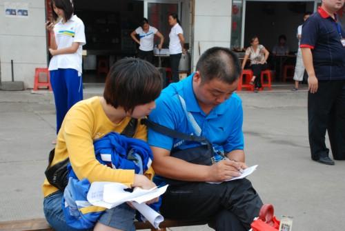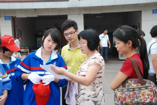 校团委胡平书记与班主任一道查看志愿者活动情况记载