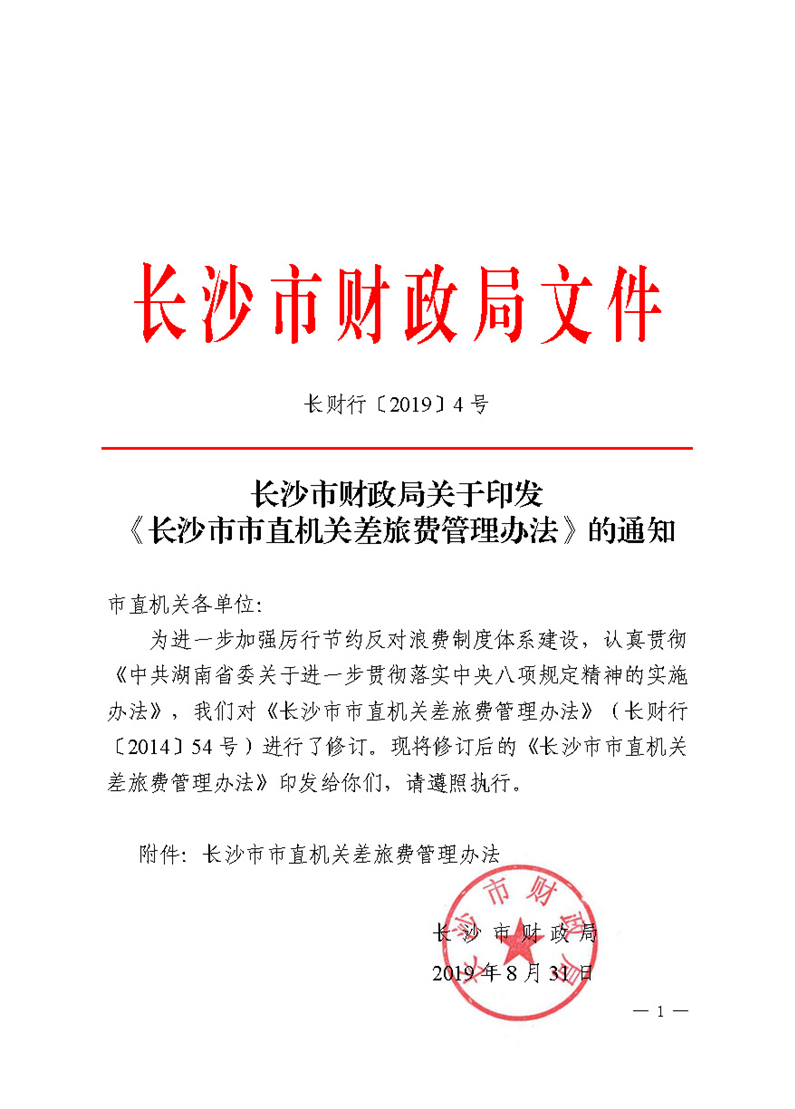 长财行〔2019〕4号长沙市市直机关差旅费管理办法 来源: 发布时间:2019-09-20 14:00:35 浏览次数: 次 【字体:小 大】 长财行〔2019〕4号长沙市市直机关差旅费管理办法 终审:易金刚 分享到: 【打印正文】
