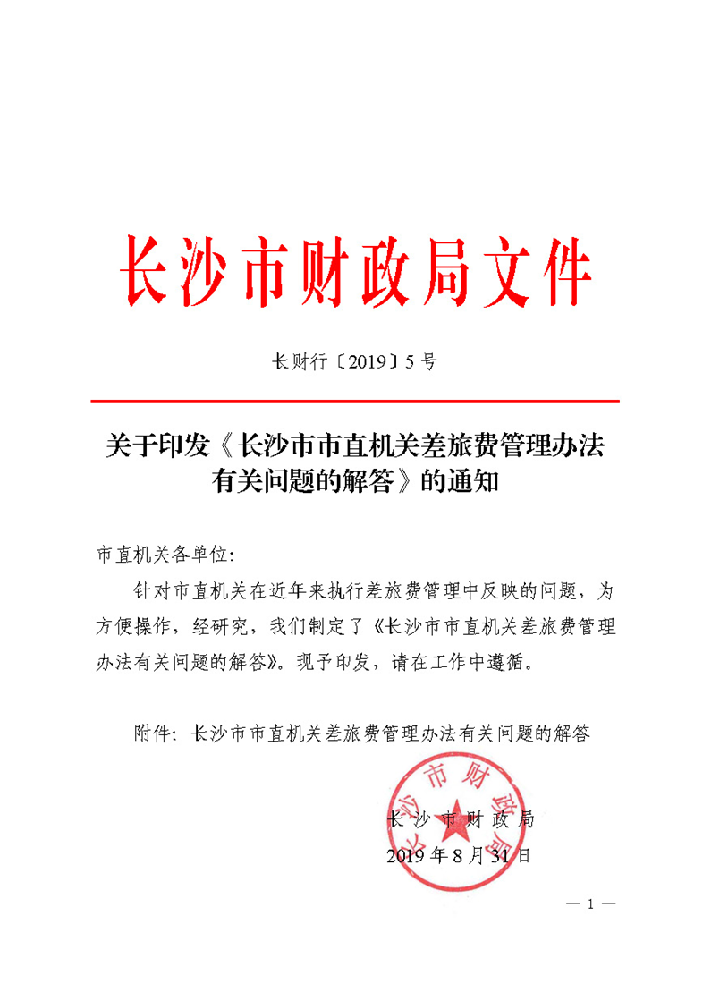 长财行〔2019〕5号 长沙市市直机关差旅费管理办法有关问题的解答 来源: 发布时间:2019-09-20 14:25:44 浏览次数: 次 【字体:小 大】 长财行〔2019〕5号 长沙市市直机关差旅费管理办法有关问题的解答 终审:易金刚 分享到: 【打印正文】