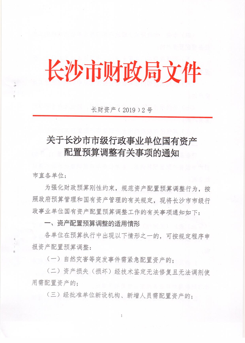 长财资产[2019]2号关于长沙市市级行政事业单位国有资产配置预算调整有关事项的通知 来源: 发布时间:2019-03-05 10:25:39 浏览次数: 次 【字体:小 大】 终审:易金刚 分享到: 【打印正文】