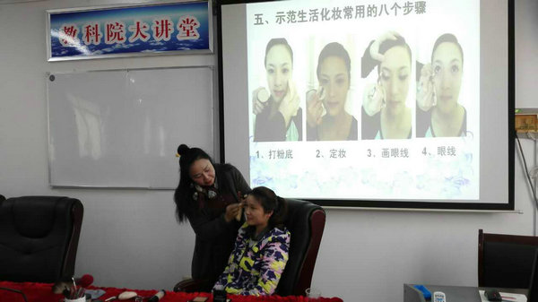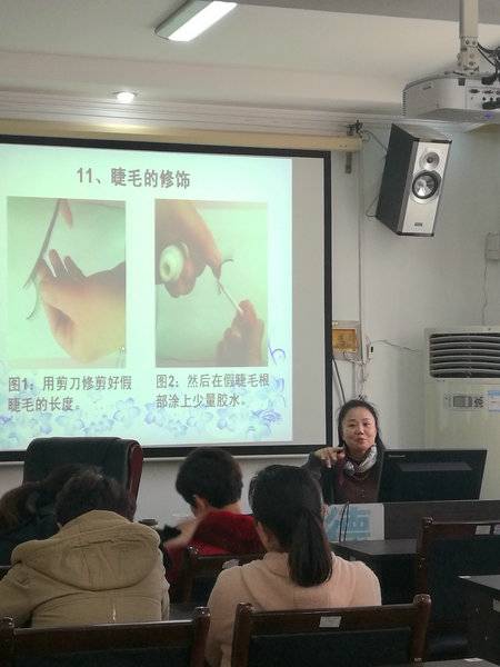 课堂上,刘老师着重介绍了皮肤护理的基础知识,几款适合教师的生活妆,以及几款日常的韩式编发造型,并现场演示化妆的技巧及发型的变化,趣味性、操作性、观摩性极强,在轻松愉快的氛围中传授了化妆的基本技巧。