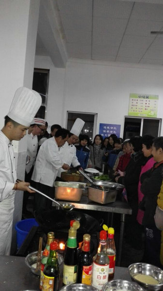 我校湘菜大师邹明德、聂波亲自出马,飞刀上阵,用手魔术般地打造了十道精选传统湘菜。大烩全家福、香煎活鳜鱼、清蒸整鸡、发丝牛百叶、原味寒菌、酱汁肘子、八宝果饭、麻仁香酥鸭、鸡汁菜苞、蕌子炒腊肉。大烩全家福汁浓醇香,八宝果饭入口香稠,香煎活鳜鱼鲜美嫩滑,麻仁香酥鸭鲜嫩滑爽,酱汁肘子香浓入味……大师们技艺高超,一道道色香味俱全的湘菜让人垂涎欲滴,现场的学员们专心致志学习,不时提问,大师讲解周到细致,总能给学员满意的答案。每学习并品尝完一道菜,大家都赞不绝口。一学员学习完毕后兴高采烈的说:“今年过年我可以在娘家和婆家露一手啦!”,言语中流露出无比的自信与自豪。