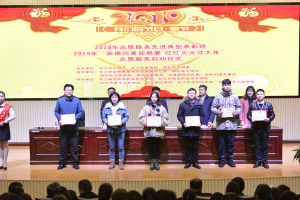 1月9日上午,长沙市文明办、长沙市教育局主办,长沙职业教育基地综合协调办公室、雨花区同升街道办事处承办的2018年志愿服务先进典型表彰暨2019年“崇德向善迎新春 红红火火过大年”志愿服务启动仪式在长沙市职教基地图书馆二楼汇报厅举行。我校副校长陈朝辉受邀出席活动。