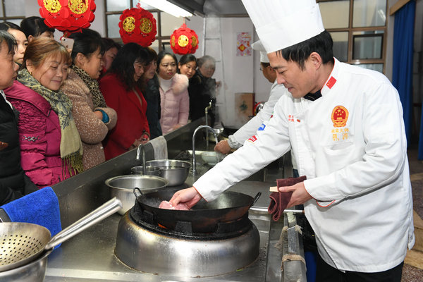 仪式后,社区居民在同升街道党工委曹旭鑫副书记的带领下,在学校党委书记彭建成、党办副主任许红萍的陪同下共同参加了学校准备的“红红火火过大年”的系列活动。除夕夜最让人期待、最温馨幸福的,莫过于一家人开心团聚,一起吃年夜饭。此次活动,学校特邀校优秀教师、全国烹饪大师,湘菜大师聂波主理筵席,推出“湘菜大师教你做年夜饭”活动。烹饪实训室内,聂波老师与徐建桥老师正在给大家讲解“红炜肘子”、“银耳桔露汤丸”、“东安鸡”等一道道年夜菜的制作过程,精湛的技艺,娴熟的功夫,不少居民竖起了大拇指,在感慨烹饪技能绝妙的同时,也对老师们通过职业教育培养学生传承一身本领表示钦佩。在学习年夜饭的同时,大家还品尝到了传统年夜菜“蒸蛋卷”,居民纷纷表示,品尝到了大师的味道、湘菜的味道、年夜饭的味道。