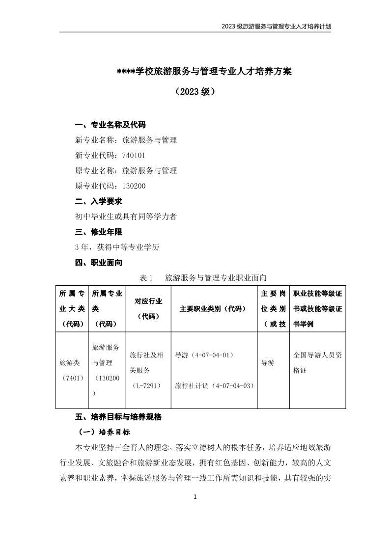 旅游服务与管理专业人才培养计划