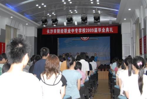 2009年7月8日,对于长沙市财经职业中等专业学校2009届的毕业生们来说,是他们难忘的日子。千名毕业生、校行政领导和老师相聚在学校,隆重举行“长沙市财经职业中专2009届毕业典礼”。 在毕业典礼上,学校领导、教师代表和学生代表分别发言,由校长助理夏延刚主持会议。蔡稳良副校长首先代表学校,祝贺09届毕业生圆满完成了自己的学业并取得了优异成绩,并对他们提出了几点希望,希望大家全面发展,心存感恩,不怕困难,在将来的工作和生活中继续努力、积极上进,迎接更美好的未来。教务处杨立东主任宣读了本届毕业生的毕业情况,并颁发了合格毕业证书。教师代表李伟达老师表达了对同学们未来的美好祝愿和殷切期望。毕业生代表就业8班的熊玲同学回顾了在我校的成长历程,表达了他们对母校的依恋和对恩师的感激之情,并表示将牢记母校的谆谆教导,以将来的成功来回报辛勤培育自己的母校。 最后,全体毕业生深情高歌一曲《毕业歌》,把毕业典礼再次推向了高潮。今天,他们以母校为荣;明天,母校也将以他们为骄傲!祝愿毕业生们,在将来的人生道路上,鹏程万里!(撰稿/贺红 摄影/王煌)