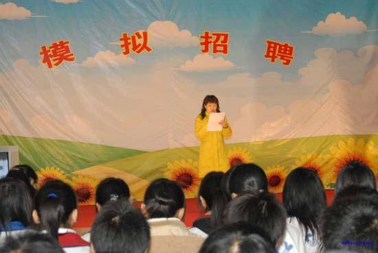12月21日下午长沙市财经职业中专学校多功能活动室内正在举行一场别开生面的“模拟招聘会”,来自高二年级经过层层筛选的10位优秀学生身着职业装参加现场招聘会,全校两千余学生在教室收看现场转播。