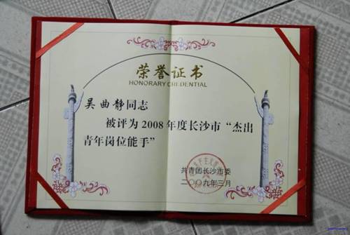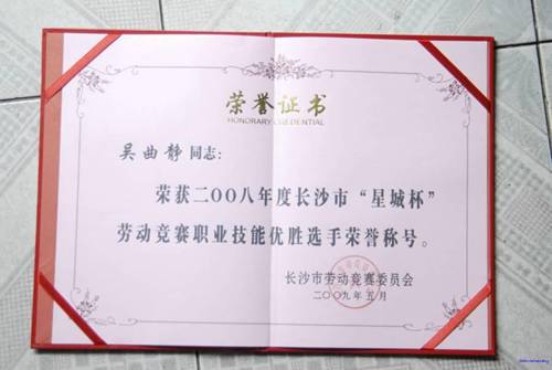 5月13日,长沙市2008年度劳动竞赛表彰大会在枫林宾馆隆重举行,我校计算机组吴曲静老师荣获长沙市“星城杯”职业技能竞赛优胜选手、,“长沙市技术能手”、“长沙市杰出青年岗位能手”和长沙市“巾帼建功”标兵等荣誉称号,并被记长沙市“二等功”。