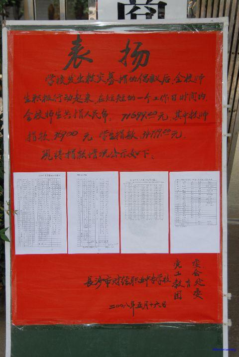 5﹒12汶川大地震噩耗传来,财职师生都沉浸在悲痛中,老师和同学们纷纷自发的组织起来,为灾区人民祈福,时刻关注着救灾工作的进展。15日,在接到上级募捐的号召后,我校师生紧急动员起来,由校领导带头,共向灾区捐款16.40383万元。我校的学生在这次活动中表现得尤为突出,很多家境并不富裕的同学把自己一个星期的生活费都捐了出来,场面十分感人。在学校的组织下,同学们还准备利用周末的时间上街进行义卖,为灾区人民募捐。(文/陈智球 摄影/刘首飚)