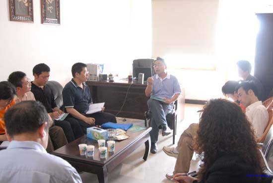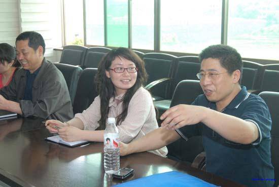 就业指导中心雷主任(右)与企业领导交流