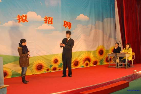 12月21日下午长沙市财经职业中专学校多功能活动室内正在举行一场别开生面的“模拟招聘会”,来自高二年级经过层层筛选的10位优秀学生身着职业装参加现场招聘会,全校两千余学生在教室收看现场转播。 本次“模拟招聘会”分为递交简历、自我介绍、现场答问、即兴应变等环节,10位参赛选手或妙语连珠,或双语并用,或机智幽默。最后97班唐千、110班章跳两名同学以良好的专业素养,理性、务实而又机智的精彩回答赢得了台下的阵阵掌声,获得了本次比赛的一等奖。专业教师王海燕老师分别针对参赛选手的整体着装、举止神态、面试技巧及与评委的感情交流等方面做了专业点评。