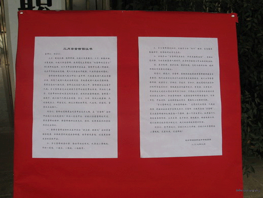 弘扬雷锋精神 与文明同行 做文明青年---长沙市财经职业中专学校学雷锋活动报道(一) 来源: 发布时间:2007-03-06 00:00:00 浏览次数: 次 【字体:小 大】 今年3月5日是毛泽东同志“向雷锋同志学习”题词发表44周年,也是我市创建全国文明城市全面提升的关键之年。为了进一步弘扬和培育新时代雷锋精神,根据局团委要求我校认真组织青年学生开展一系列学雷锋的活动:在新学期开学之际校团委向全校青年学生发出倡议:“弘扬雷锋精神,与文明同行,做文明青年”。同时,于3月7日中午校团委组织150余名团员青年在芙蓉路段开展人行道的清扫、街道两边护栏的清洗以及在路口处义务执勤等活动。 (校团委) 分享到: 【打印正文】