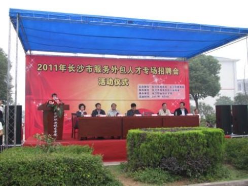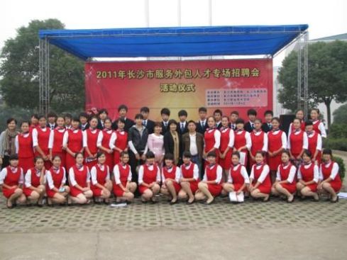 2011年11月4日,2011年长沙市服务外包人才专场招聘会在长沙职业技术学院雷锋镇校区隆重拉开帷幕。这次招聘会由长沙市商务局、长沙市教育局联合主办,67家服务外包企业、长沙市属各大中专院校毕业生参加了这次招聘会。我校航空服务专业499班同学作为代表参加了此次招聘会。