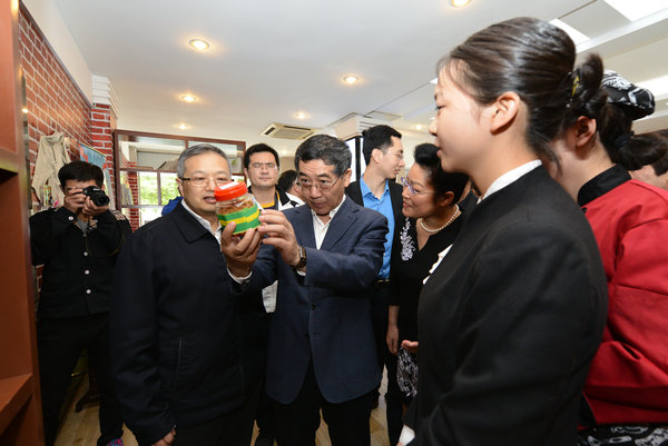 王建国司长、王柯敏厅长仔细观看我校学生创业团队的产品