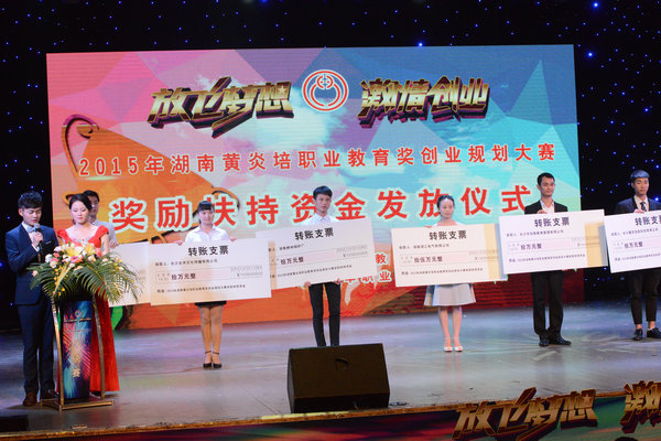 6月27日,由湖南省教育厅主办、湖南中华职业教育社承办的 “2015年湖南黄炎培职业教育奖创业规划大赛奖励扶持资金发放仪式”在湖南大众传媒职业技术学院演播厅隆重举行。