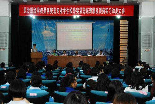 2014年6月27日上午9:00,我校美容美发专业二年级学生校外实训总结表彰及三年级顶岗实习动员大会在荷花池校区报告厅隆重召开。大会由二分部王海燕部长主持,参加会议的有学校肖建军校长、主管学校教学、实习就业的彭建成副校长、湖南省美协简谷平会长、企业专家、学校美容美发专业总监莫愁先生及8家企业代表和参加本次校外实训的全体师生。